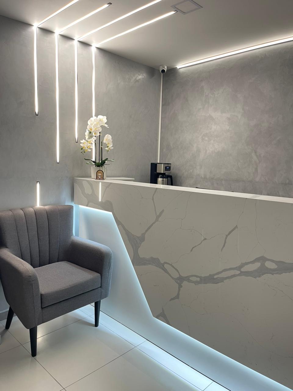 En este proyecto, aplicamos microcemento en las paredes de una clínica dental, logrando un acabado moderno, elegante y fácil de mantener.
